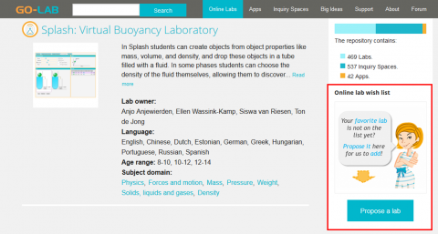 If you want to propose an online lab to be included in the Go-Lab Portal on golabz.eu, please email your request at [email protected] with subject “Go-Lab - new lab proposal”. In your email, please include the name of the lab, its web-link, and a paragraph describing shortly what this lab is about and which science subjects it is related to.