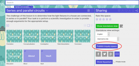 Once you have created your ILS, you can publish it in the Go-Lab Portal, on golabz.eu. Just click on the “Publish inquiry space” button that appears at the right-hand side of your ILS in Graasp in the “sharing” tab.